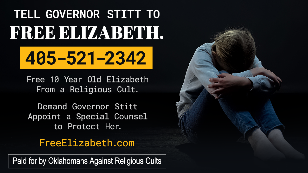 All Oklahomans must contact Governor Kevin Stitt, DHS Head Jeffrey Cartmell, and Tulsa County Judge Matthew Todd Chesbro TODAY to ensure that Elizabeth’s safety, health, and well-being are protected through an immediate, independent review of the facts surrounding her care and custody by Special Counsel.